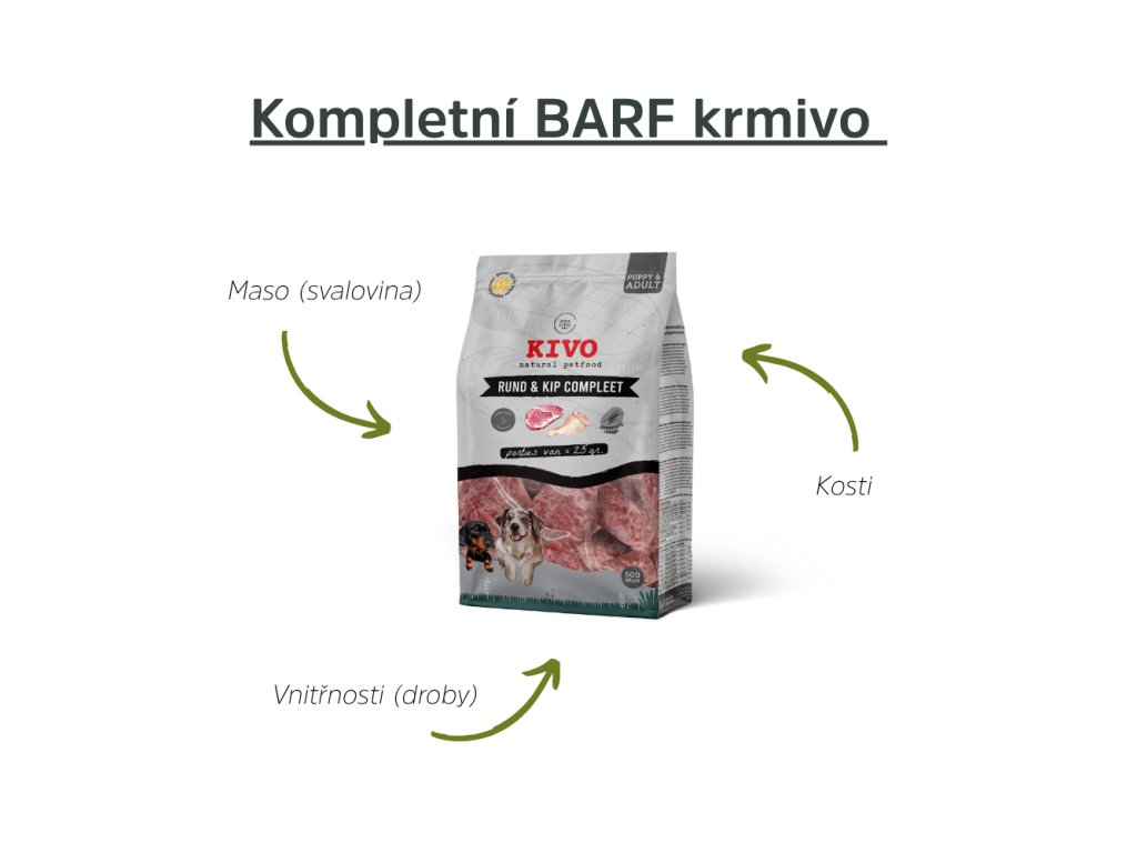 - Kompletní BARF krmivo – vyvážený poměr masa, vnitřností a kostí